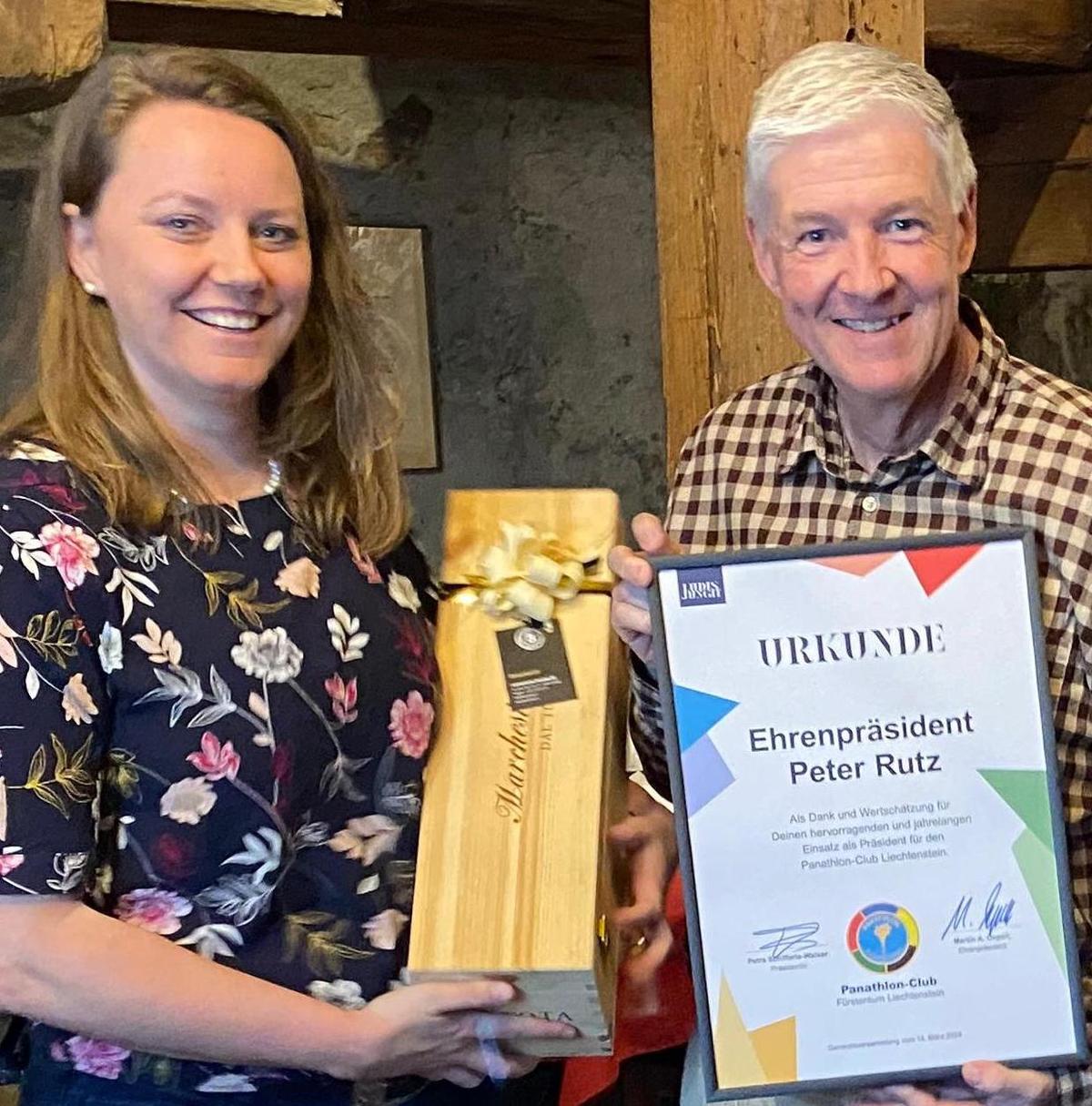 In den Jahren 2012 bis 2021 zeichnete Peter Rutz als Präsident des PCFL verantwortlich. Seinem Engagement ist es zu verdanken, dass der Club bestehen blieb. Mit viel Elan und Freude organisierte er diverse Anlässe und Dank seinem Engagement vergrösserte sich der Panathlon Club mitgliedermässig während seiner Amtszeit. An der diesjährigen GV wurde ihm nicht zuletzt deshalb die Ehrenpräsidentschaft verliehen. Dies wurde mit viel Applaus bestätigt. Eine gute Flasche Wein, sowie eine Urkunde sind nur ein kleines Dankeschön für die Dienste, die er im Namen des Sports leistete.